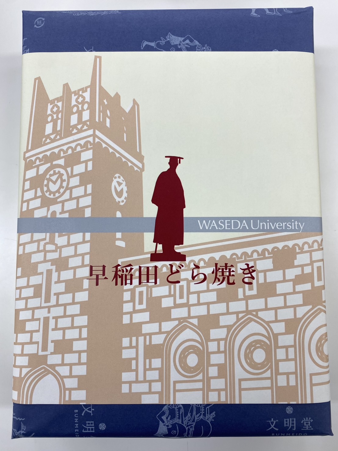 文明堂の包装紙に、早稲田大学オリジナルの掛け紙をつけています。