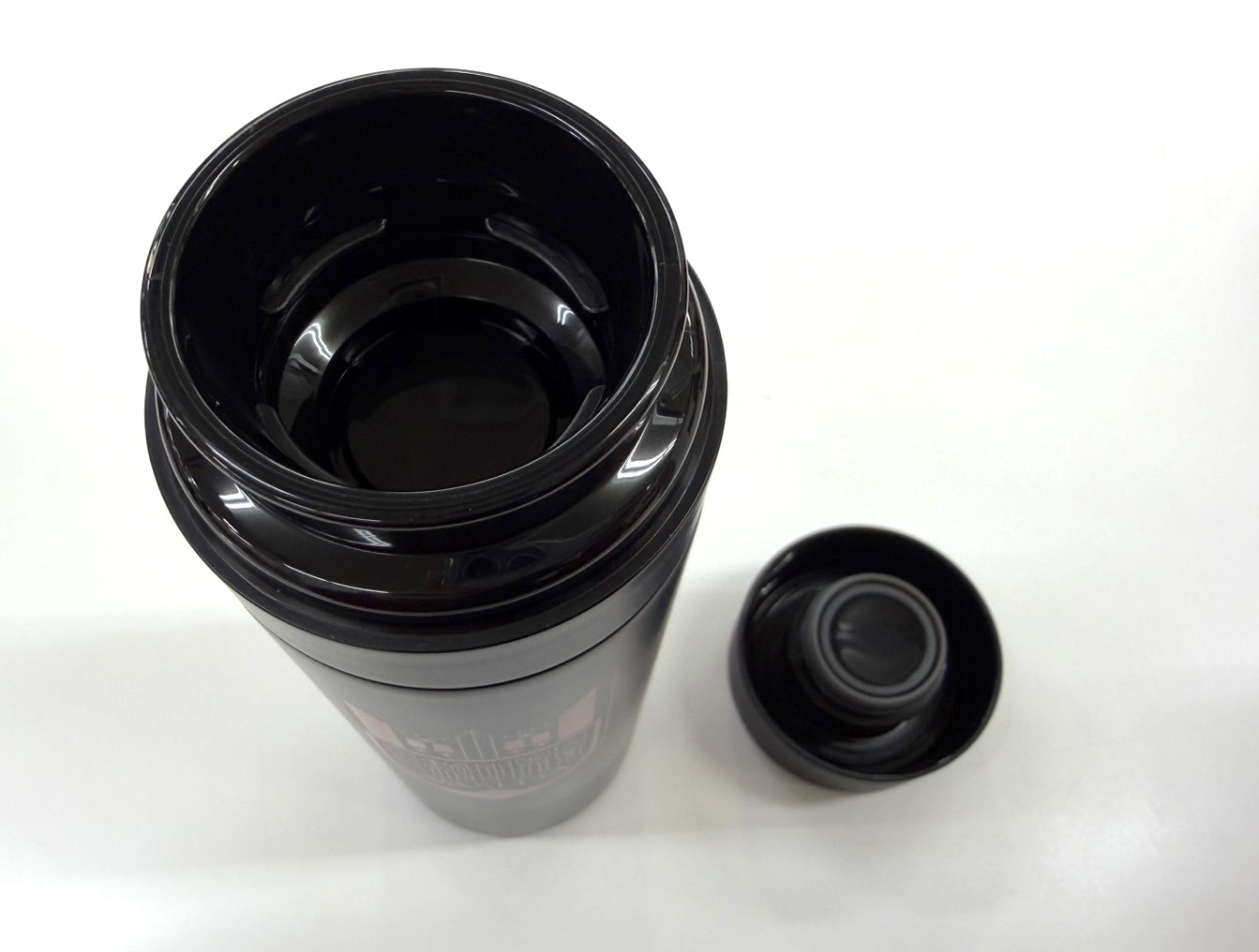 エンブレムを取り入れたデザインのサーモステンレスボトル。